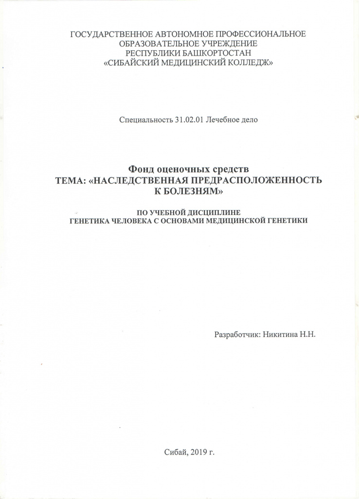 Фонд оценочных средств по УД Генетика человека с основами медицинской генетики Тема «Наследственная предрасположенность к болезням» Специальность 31.02.01 Лечебное дело / Н.Н. Никитина. ГАПОУ РБ «Сибайский медицинский колледж», 2019. – 12 с. |
