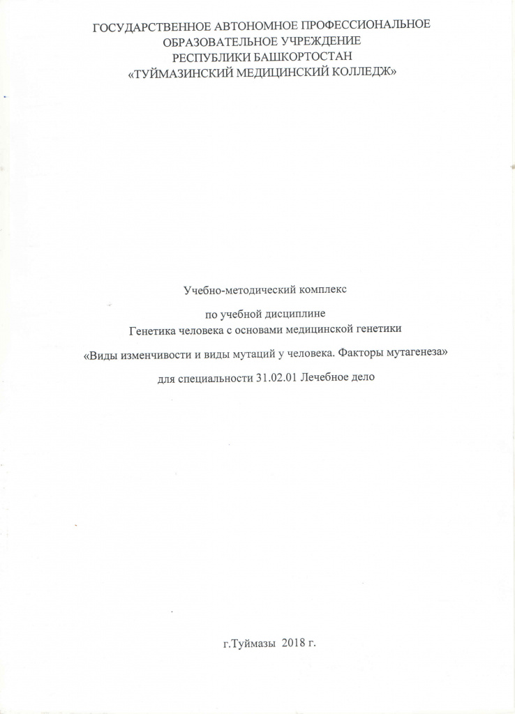 Комплексное учебно-методическое обеспечение по учебной дисциплине Генетика человека с основами медицинской генетики для специальности 31.02.01 Лечебное дело. Тема учебно-методической разработки теоретического занятия «Виды изменчивости и виды мутаций у человека. Факторы мутагенеза», 2020. – 10 с./ Л.Н. Асадуллина. Тема учебно-методической разработки практического занятия «Виды изменчивости и виды мутаций у человека. Факторы мутагенеза», 2020. – 9 с./ Л.Н. Асадуллина. ГАПОУ РБ «Туймазинский медицинский колледж» |