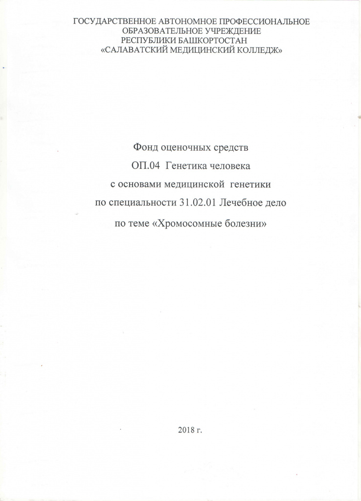 Фонд оценочных средств по УД Генетика человека с основами медицинской генетики Тема «Хромосомные болезни» Специальность 31.02.01 Лечебное дело / С.Х. Хусаинова. ГАПОУ РБ «Салаватский медицинский колледж», 2018. – 9 с. |